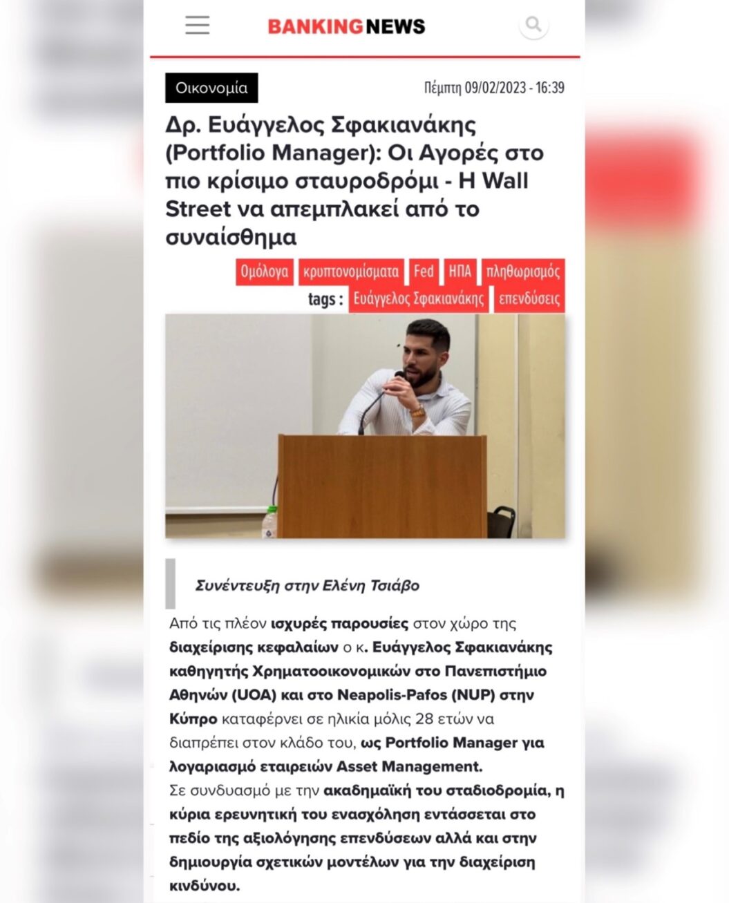 Από τις πλέον ισχυρές παρουσίες στον χώρο της διαχείρισης κεφαλαίων ο κ. Ευάγγελος Σφακιανάκης καθηγητής Χρηματοοικονομικών στο Πανεπιστήμιο Αθηνών (UOA) και στο Neapolis-Pafos (NUP) στην Κύπρο καταφέρνει σε ηλικία μόλις 28 ετών να διαπρέπει στον κλάδο του, ως Portfolio Manager για λογαριασμό εταιρειών Asset Management.